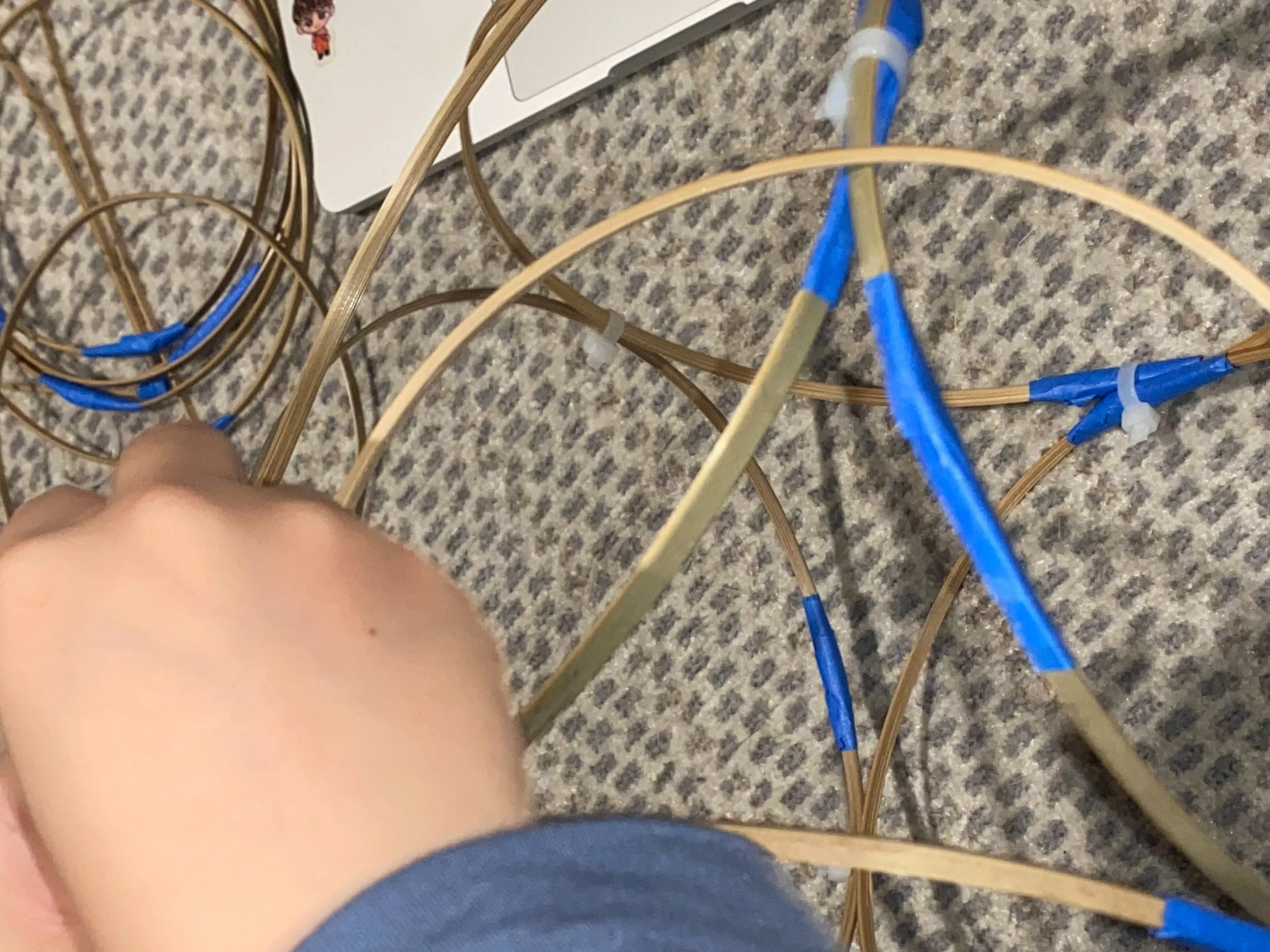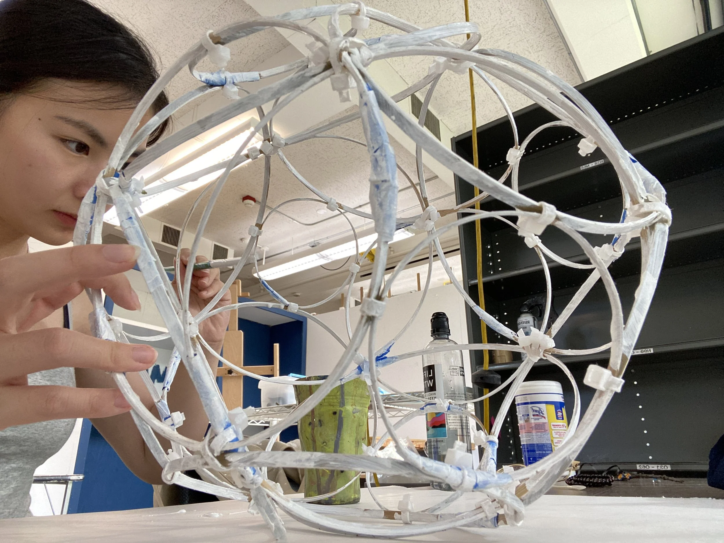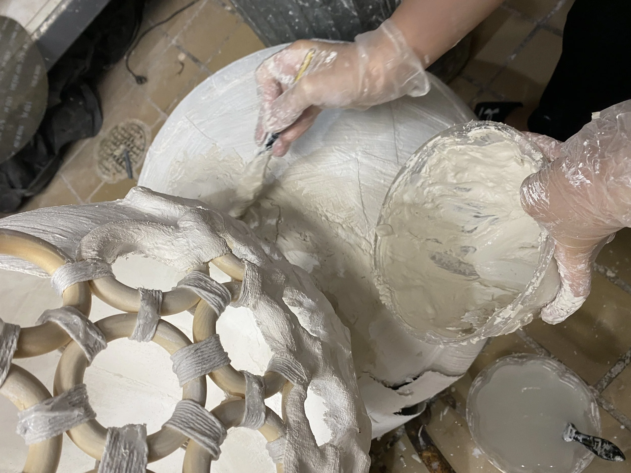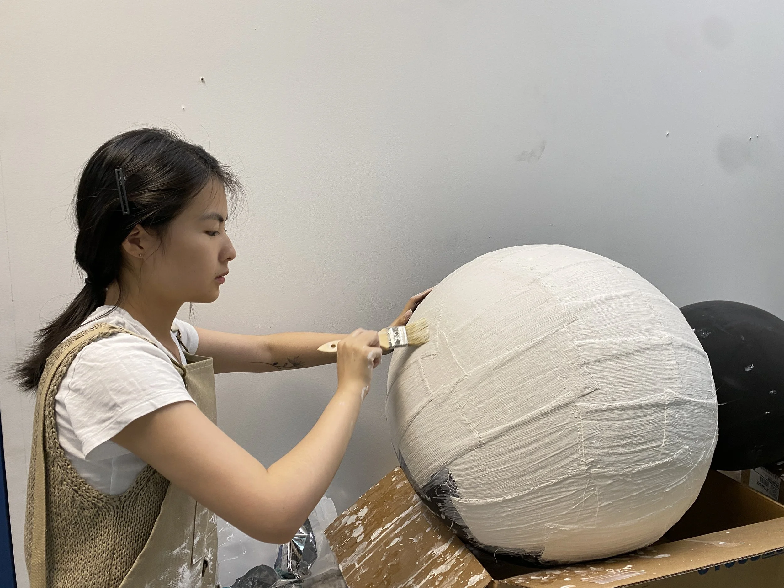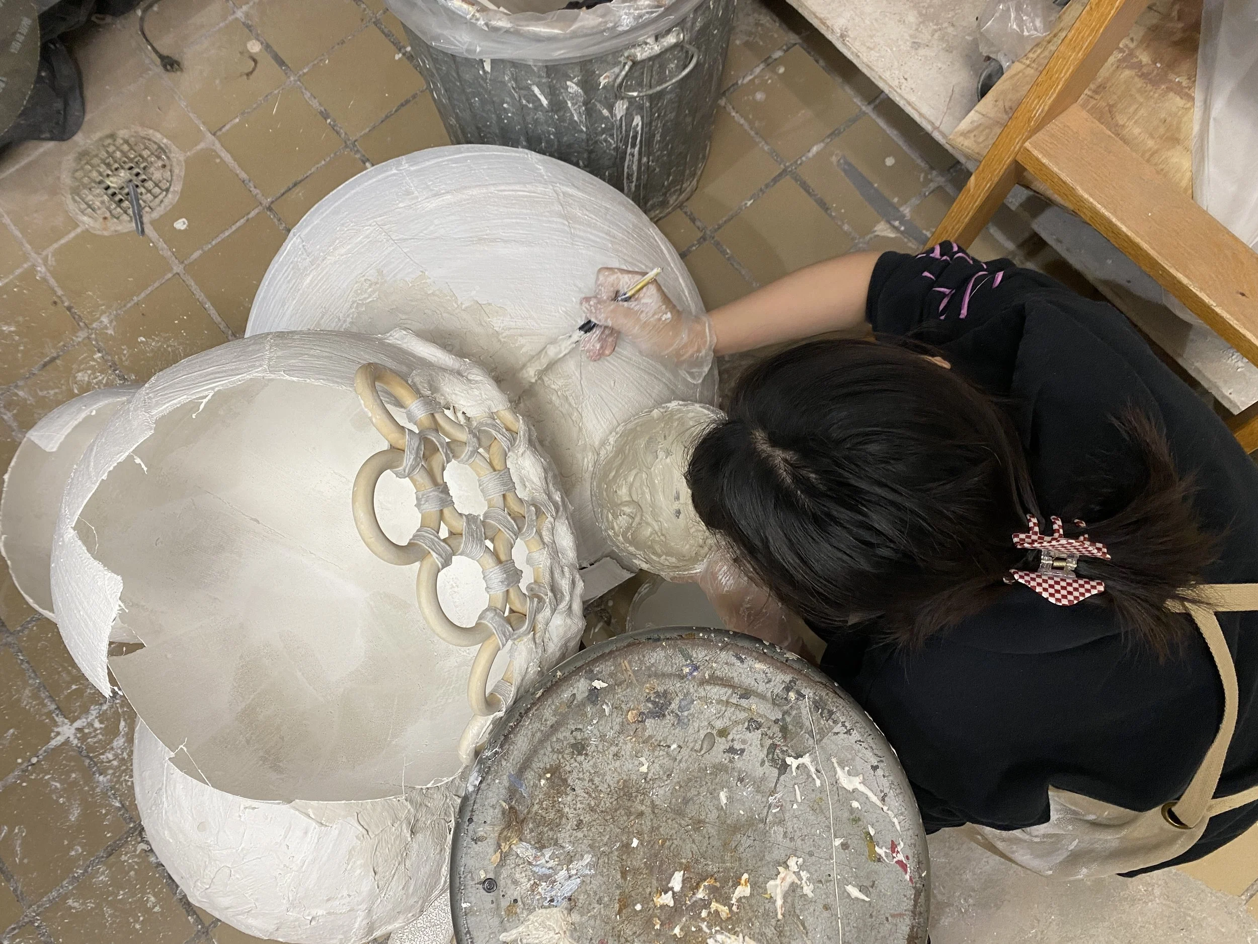 I drew inspiration for this piece from interacting with local artisans who specialized in hand-crafting Dragon Lanterns with bamboo. Crafting a replica of the original Dragon Ball–used in the folk performance– out of plaster with their contemporary use in medical treatment, I target to symbolize modernity through their technological advancement while representing the traditional cultures injured and traumatized by modernity. The creative process by which soft plaster bandages hardened yet in a fragile condition renders a visual metaphor for the malleability and resistance in reshaping cultural practices, which is relevant for reviving the Dragon Dance. The Dragon Balls suspended from the ceiling are designed to interact with the audience through bouncing or patting. The experimental film projects the Dragon Ball mesmerizingly, stretching its form to reshape cultural tradition.